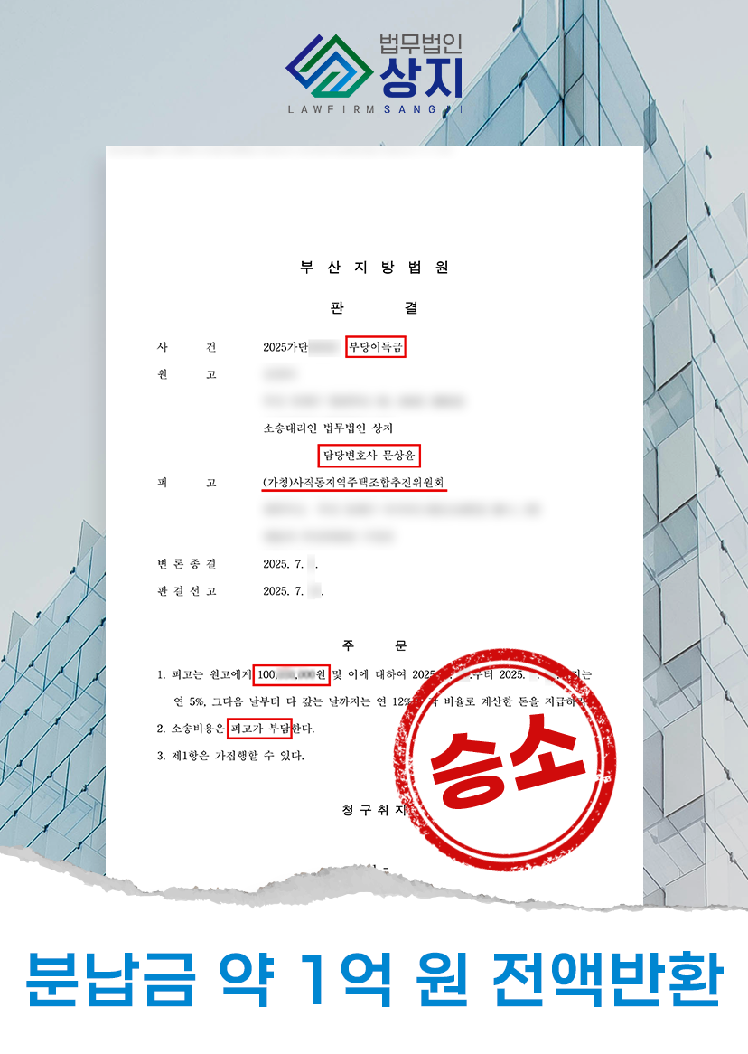 의뢰인은 동래구 사직동 144-1 일대에서 추진되는 (가칭) 사직동지역주택조합과 가입 계약을 체결하였습니다. A씨가 납부한 업무대행비 및 분담금은 약 100,000,000원으로, 전액 회수를 목표로 상담을 진행했습니다.