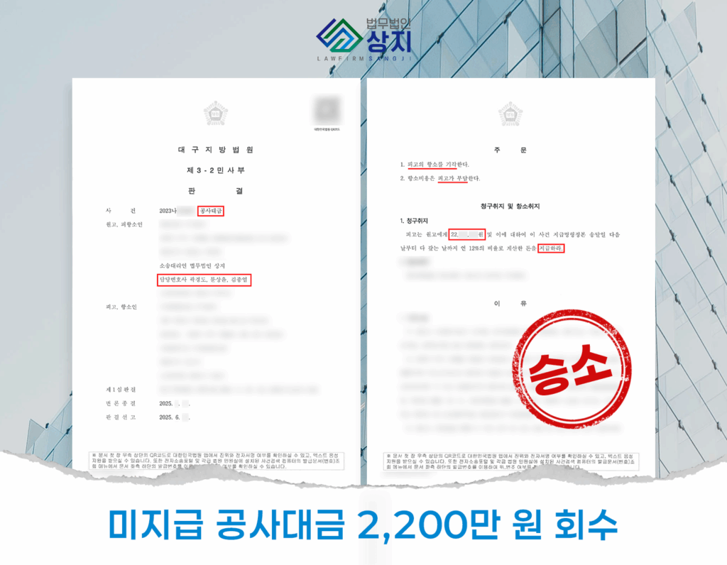 Services 부산 건설/부동산 변호사 공사대금 2심 승소 (2,200만, 면허대여·재하도급) 명의대여자의 책임을 인정받아 항소심에서 승소했습니다. Explore 보증금 반환 소송 (2.6억, 부산 동부지원) 오피스텔 보증금 전액 반환을 목표로 신속한 소송을 진행했습니다. Explore 보증금 반환 소송 (1.2억, 부산 동부지원) 유사한 미반환 문제에 대해 즉시 법적 절차를 착수했습니다. Explore 건설/부동산 Get In Touch